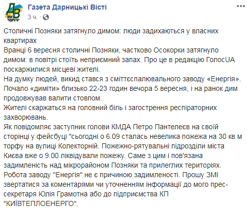 "Внимание! Сегодня в 6:09 произошел небольшой пожар на 30 кв м торфа на улице Коллекторной. Пожарно-спасательные подразделения города Киева уже в 9:00 ликвидировали пожар. Именно с этим и связана задымленность над микрорайоном Позняки и прилегающих территориях. Работа завода "Энергия" не является причиной задымленности", - говорится в опубликованном сообщении.