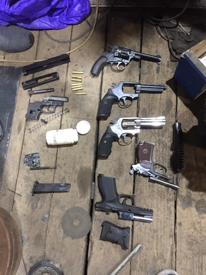 Уточняется, что в ходе расследования уголовного производства о незаконном обращении с оружием, проведен ряд обысков на территории Киевской области, во время которых обнаружено и изъяли 10 предметов похожих на пистолеты; части для пистолетов (пружины, затворы, магазины); 1400 предметов похожих на патроны калибра 7х62 и 9 мм.