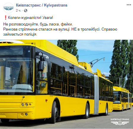 "Не распространение, пожалуйста, фейки. Утренняя стрельба произошла на улице. Не в троллейбусе. Делом занимается полиция", - сказано в сообщении.