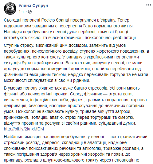 "Чтобы преодолеть последствия плена с самого начала с пленниками должны работать специально обученные военные психологи. Они помогают им управлять эмоциональными аспектами освобождения - понять свой опыт и его особенности. Такой метод называется "дебрифинг" - он включает полный опрос, детализированный обзор событий с систематическим изучением фактов и эмоциональных реакций, связанных с этим опытом. Этот метод эффективен и помогает избегать серьезных посттравматических стрессовых реакций, депрессии и других психических расстройств, которые могут возникать как последствия плена. Это - начало возвращения к нормальной жизни", - пояснила Супрун.