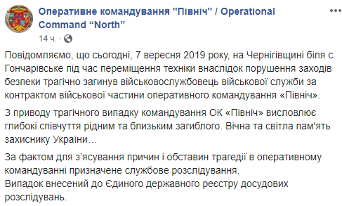 В субботу, 7 сентября в Черниговской области, около села Гончаровское, при перемещении техники погиб украинский военный. Об этом в Facebook сообщает оперативное командование "Север".