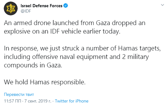 "Вооруженный беспилотник, выпущенный из Газы, сегодня утром сбросил взрывчатку на транспортное средство армии Израиля. В ответ мы только что нанесли удар по нескольким целям ХАМАСа, включая склады военно-морской техники и два военных соединения в Газе", - говорится в сообщении.