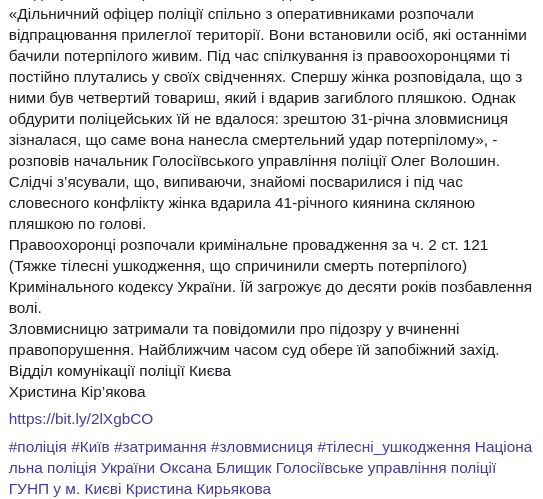 Следователи выяснили, что, выпивая, знакомые поссорились и во время словесного конфликта 31-летняя женщина ударила 41-летнего киевлянина стеклянной бутылкой по голове, в результате чего он умер.