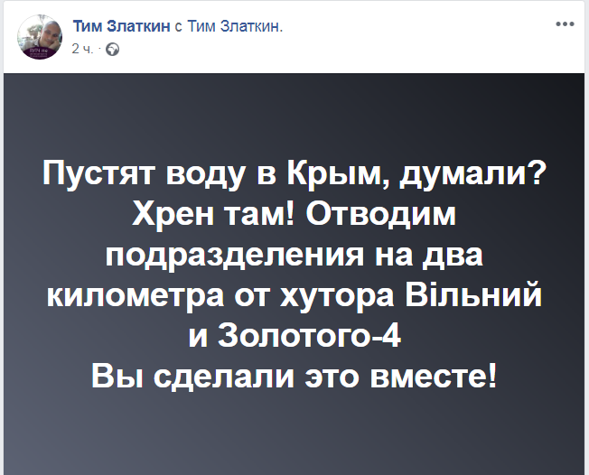"Пустят воду в Крым, думали? Хрен там! Отводим подразделения на два километра от хутора Вольний и Золотого-4. Вы сделали это вместе!" - с явным неудовольствием отметил волонтер.