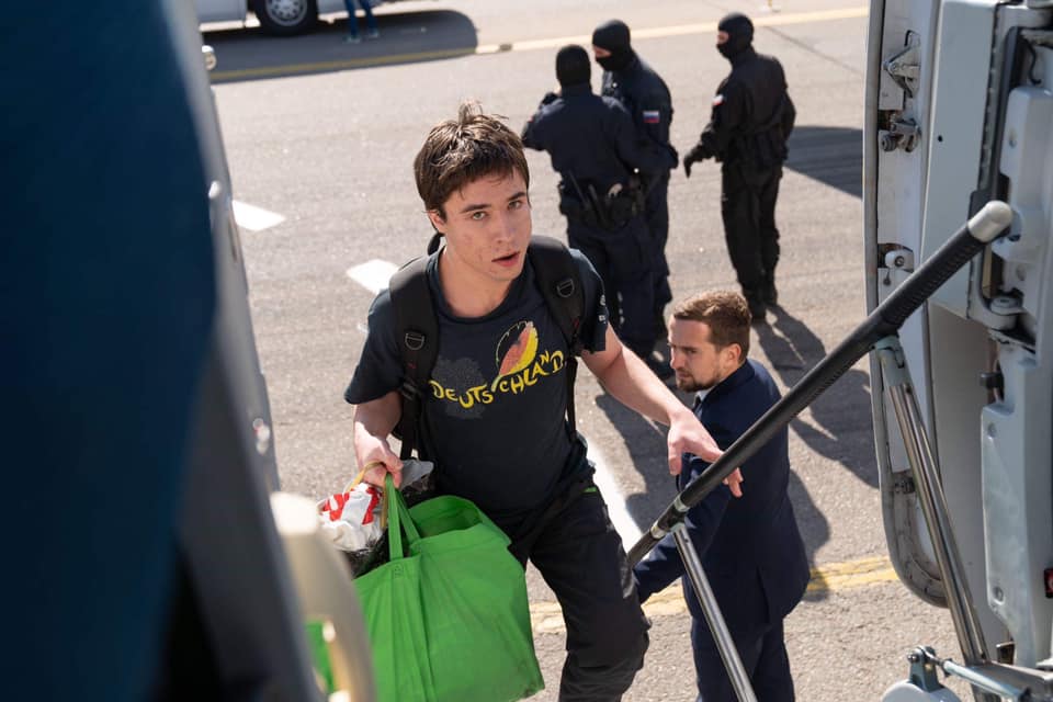 Следующая часть фоторепортажа показывает, как в салон самолета поднимаются граждане Украины. Первый из них - Павел Гриб.