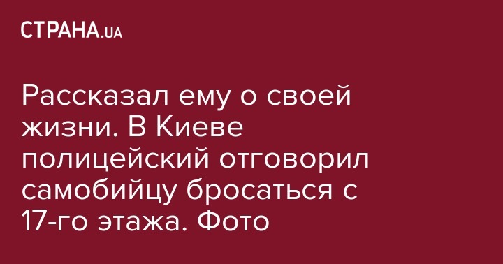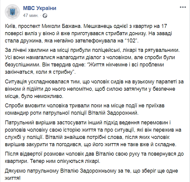 В Киеве патрульный полицейский смог уговорить мужчину, решившего покончить с собой, не делать последний непоправимый шаг. Об этом сообщается на Facebook-странице МВД Украины.