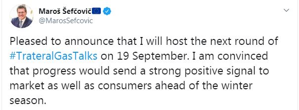 Вице-президент Европейской комиссии по Энергетическому союзу Марош Шефчович заявил, что следующий раунд трехсторонних переговоров с Европейским союзом и Россией относительно транзита российского газа пройдет 19 сентября 2019 года. Об этом он написал в своем микроблоге Twitter.