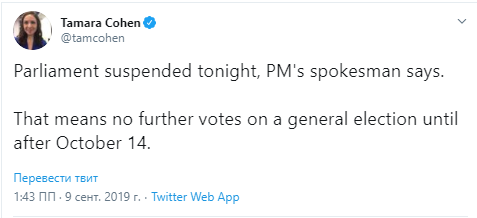 Напомним, в конце августа королева Великобритании Елизавета II одобрила просьбу премьера Бориса Джонсона временно прекратить работу парламента, чтобы он не смог заблокировать выход Британии из Евросоюза без соглашения. Поэтому британский парламент прекратит свою работу с 9 сентября по 14 октября.