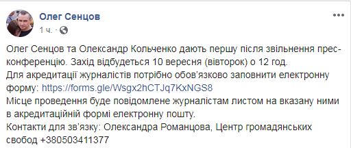 Освобождены политзаключенные Олег Сенцов и Александр Кольченко дадут первую после освобождения пресс-конференцию. Об этом говорится в сообщении на странице Олега Сенцова в Facebook.