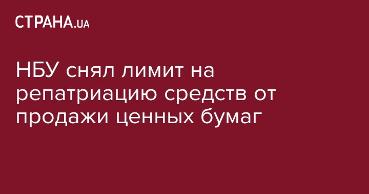 Национальный банк Украины (НБУ) отменил ежемесячный лимит в сумме EUR5 млн на репатриацию средств от продажи ценных бумаг, корпоративных прав, а также средств, полученных в результате уменьшения уставных капиталов юридических лиц и выхода из хозяйственных обществ иностранных инвесторов. Об этом говорится в сообщении НБУ на сайте.