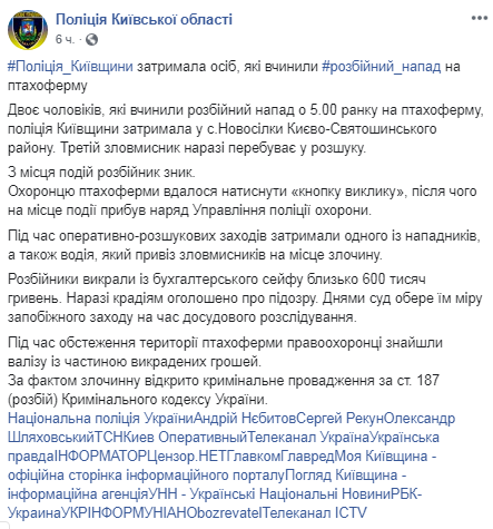 Разбойное нападение случилось в 05:00 утра. Охраннику птицефермы удалось нажать "кнопку вызова", после чего на место происшествия прибыл наряд Управления полиции охраны. Одного из нападавших, а также водителя, который привез злоумышленников на место преступления, полиция Киевской области задержала в селе Новоселки Киево-Святошинского района. Третий злоумышленник сейчас находится в розыске.