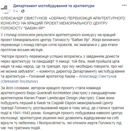 Победителем архитектурного конкурса на лучший проект Мемориального Центра Холокоста "Бабий Яр" стала команда архитектурного бюро Querkraft Architekten (Австрия) с ландшафтным архитектором Kieran Fraser Landscape Design (Австрия).