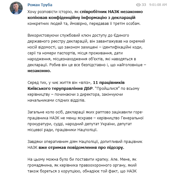Сотрудник Национального агентства по предотвращению коррупции незаконно копировал конфиденциальную информацию из деклараций и передавал ее третьим лицам. Об этом в своем телеграм-канале написал директор Государственного бюро расследований Роман Труба.