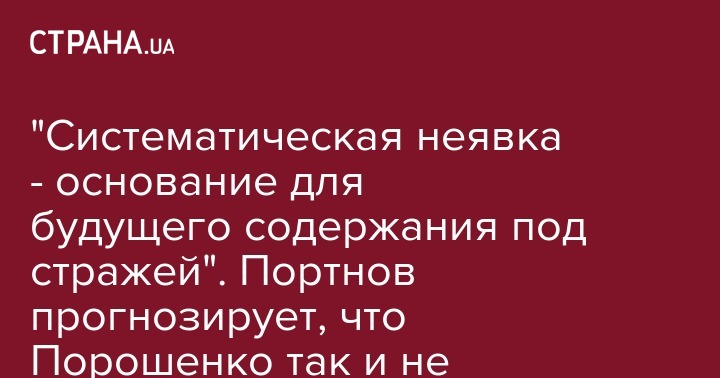 Экс-президент Петр Порошенко, который уже не пришел на назначенный на 09:30 допрос в ГБР, скорее всего, не явится и в 14:30, что может стать основанием для будущего содержания его под стражей. Об этом в Facebook написал юрист Андрей Портнов.