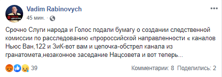 "Слуги народа и Голос подали бумагу о создании следственной комиссии по расследованию "пророссийской направленности" каналов NewsOne, 112 и Zik - вот вам и цепочка: обстрел канала из гранатомета,незаконное заседание Нацсовета и вот теперь..." - написал он.