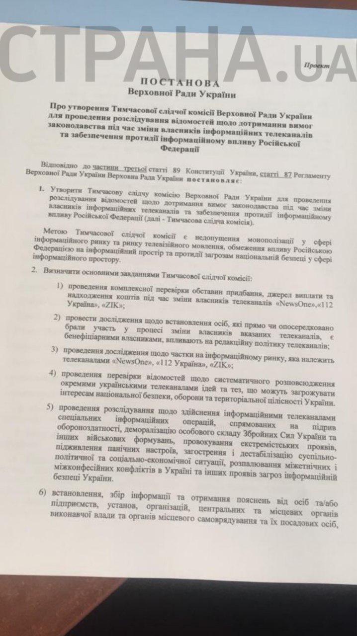 В проекте постановления Верховной Рады, который оказался в распоряжении "Страны" сказано о том, что Временная следственная комиссия Рады создается для проведения расследования информации о соблюдении требований закона во время смены владельцев информационных телеканалов и обеспечения противодействия информационному влиянию РФ.