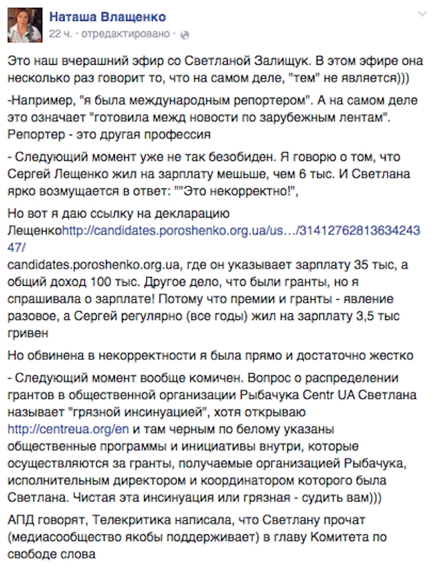 Влащенко обнародовала пост по итогам выпуска, дополнив его ремарками, которые показывали, что Залищук в некоторых моментах говорила то, что не соответствовало действительности.