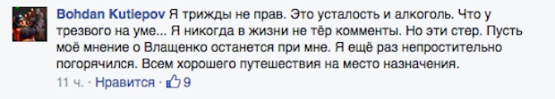 Правда через час он удалил свои комментарии и добавил другие - покаянные. Он объяснил свой выпад тем, что в нем говорили усталость и алкоголь.