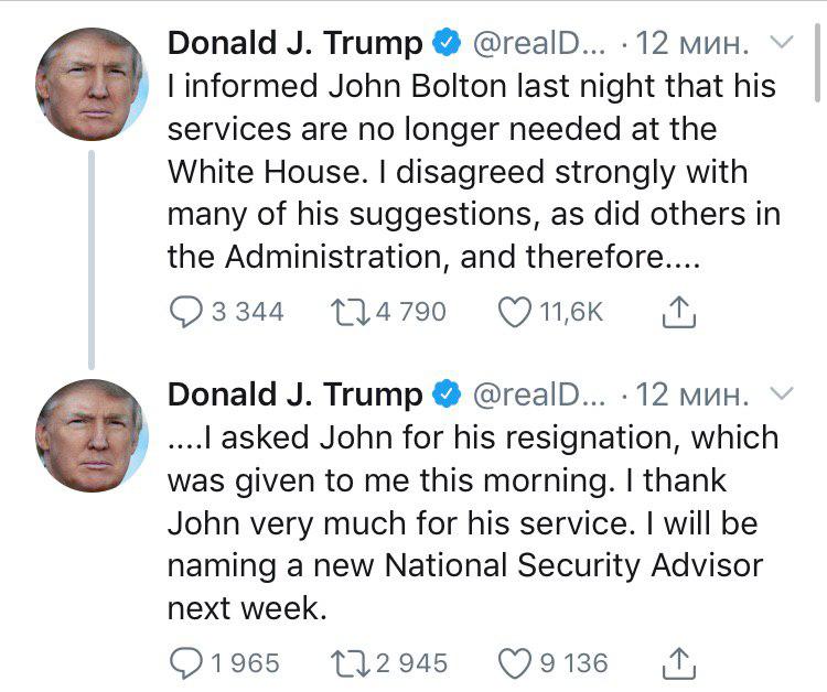 "Вчера я информировал Джона Болтона, что его услуги в Белом доме больше не нужны. Я категорически не согласен со многими из его предложений и попросил его уйти в отставку", - написал в Твиттере Дональд Трамп.