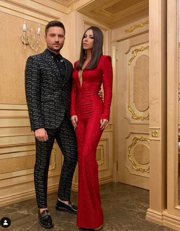 На фото певица предстала в элегантном алом комбинезоне с глубоким вырезом на груди. Лазарев, одетый в сдержанной расцветки, но эффектный костюм, обнимает Лорак за талию.