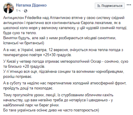 "Антициклон Friederike над Атлантикой втянет в свою систему восточный антициклон и практически вся континентальная Европа будет лежать, как в шезлонге у моря в большой шляпе, в этой замечательной солнечной погоде, будет сухо и тепло. Исключения будут, но пусть с ними разбираются местные синоптики, испанские или британские. А у нас, в Украине, завтра, 12 сентября, ожидается ясная теплая погода с температурой воздуха +25...+30 градусов", - написала Наталья Диденко.