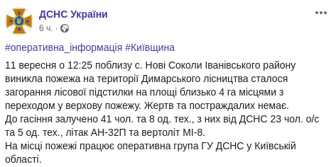 Под Киевом, на расстоянии 50 км от Чернобыля, горит лесная подстилка на площади около 6 га вблизи с.Новые Соколы (Иванковский район Киевской области). К ликвидации пожара привлечены 2 самолета и вертолет. Об этом сообщила пресс-служба ГСЧС в Facebook.