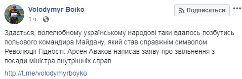 "Кажется, вольнолюбивому украинскому народу таки удалось избавиться полевого командира Майдана, который стал настоящим символом Революции Достоинства: Арсен Аваков написал заявление об увольнении с должности министра внутренних дел", – говорится в опубликованном сообщении.