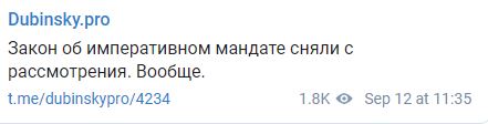 "Закон об императивном мандате сняли с рассмотрения. Вообще", - написал он.
