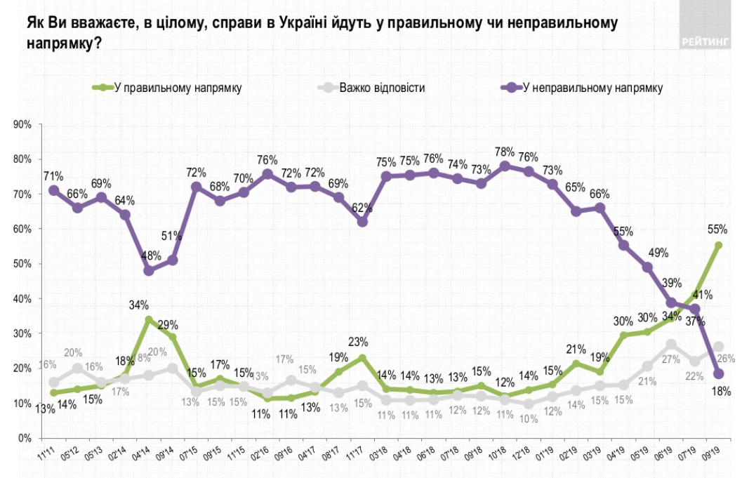 По данным социологов, 18% респондентов считают, что Украина движется в неправильном направлении, 26% – не определились по этому вопросу.