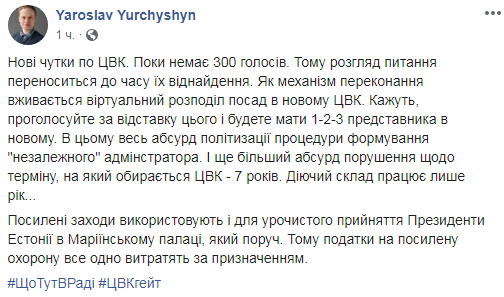 "Рассмотрение вопроса (о смене состава ЦИК - Ред.) переносится до времени их нахождения. Как механизм убеждения используется виртуальный распределение должностей в новом ЦИК. Говорят, проголосуйте за отставку этого и будете иметь 1-2-3 представителя в новом. В этом весь абсурд политизации процедуры формирования "независимого" администратора (выборов - Ред.). И еще больший абсурд, нарушения по поводу срока, на который избирается ЦИК - 7 лет. Действующий состав работает только год ...", - также отмечается на фб-странице Юрчишина.
