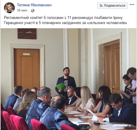 По ее данным, за такое решение проголосовали 6 членов комитета из 11 присутствующих. С заявлением о необходимости отреагировать на неэтичные высказывания Геращенко выступал лидер фракции "Слуга народа" Давид Арахания.