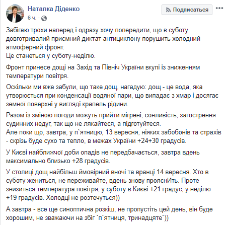 "В столице дождь наиболее вероятен ночью и утром 14 сентября. Кто в субботу женится, не переживайте, днем ​​опять прояснится. Однако снизится температура воздуха, в субботу в Киеве +21 градус, в воскресенье +19 градусов... А завтра - все еще синоптическая роскошь, не пропустите этот день, он будет хорошим, несмотря на совпадение "пятница, тринадцатое"", - написала Наталья Диденко.
