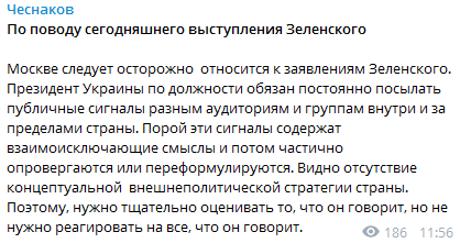 "Москве следует осторожно относится к заявлениям Зеленского. Президент Украины по должности обязан постоянно посылать публичные сигналы разным аудиториям и группам внутри и за пределами страны. Порой эти сигналы содержат взаимоисключающие смыслы и потом частично опровергаются или переформулируются. Видно отсутствие концептуальной внешнеполитической стратегии страны. Поэтому, нужно тщательно оценивать то, что он говорит, но не нужно реагировать на все, что он говорит" - написал Чеснаков.