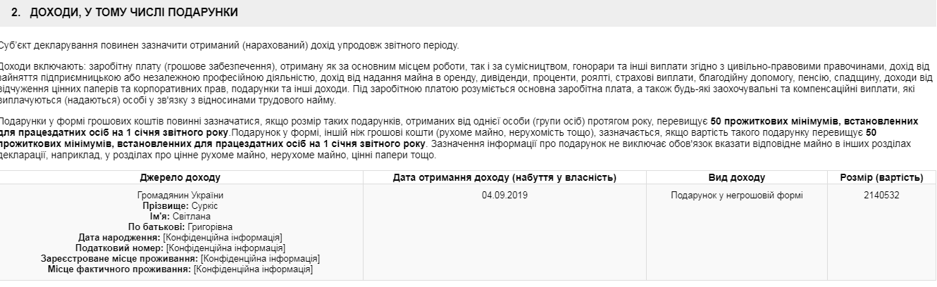 Подарок народному избраннику сделала его 47-летняя дочь, гражданка Украины Светлана. Депутат не указал, что именно получил в подарок, однако отметил его стоимость - 2,1 млн гривен.