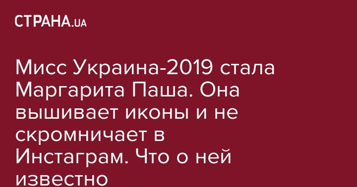 В Украине выбрали победительницу Мисс Украина-2019. Корону главной красавицы получила 24-летняя Маргарита Паша из Харькова. Теперь она представит страну на международном уровне - на  "Мисс мира" в Лондоне в декабре этого года. Рост девушки 174 сантиметра, она учится в Киевском институте международных отношений, увлекается йогой, вышивает иконы и может похвастаться званием мастера спорта по художественной гимнастике. А еще не скромничает в Инстаграм и заявляет, что может связать свое будущее с политикой.