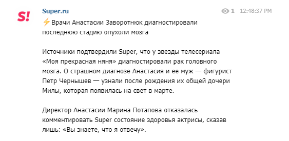 Как пишет в своем Telegram-канале российское издание Super, врачи диагностировали у Анастасии Заворотнюк последнюю стадию опухоли мозга.
