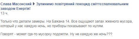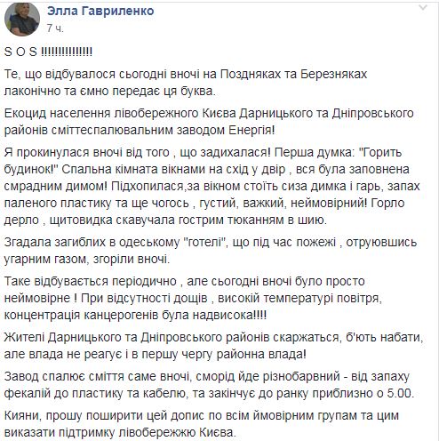 Она говорит, жители Дарницкого и Днепровского районов жалуются районным властям, но те не реагируют. "Завод сжигает мусор именно ночью, вонь идет разнообразная - от запаха фекалий до пластика и кабеля. А заканчивает жечь к утру примерно в 5:00", - пишет Гавриленко.