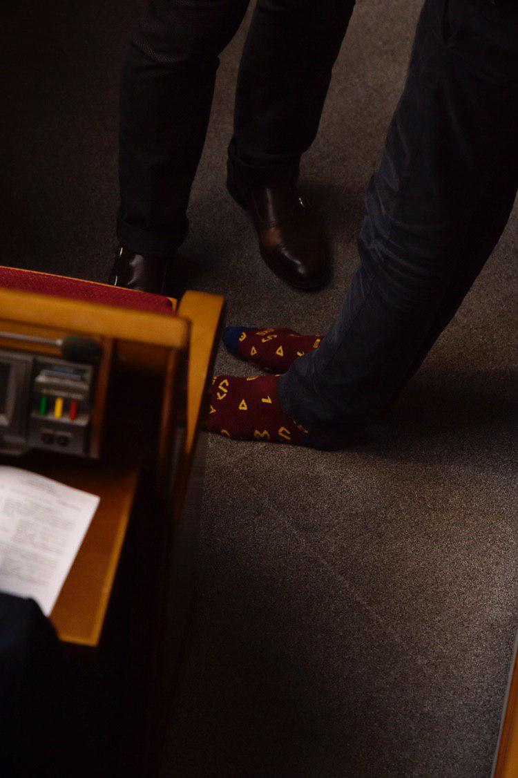 "Я как Джастин Трюдо (премьер Канады, который который известен страстью к необычным носкам - Ред.), только на украинский манер. Я ещё в Трускавце начал этот тренд против забронзовения, чтобы депутаты не превратились в говорящие головы. Чаще всего покупаю носки украинских дизайнеров: Dodo, Sammy Icon. Сегодня на мне красные носки от фирмы Under", - рассказал Алексей Жмеренецкий.