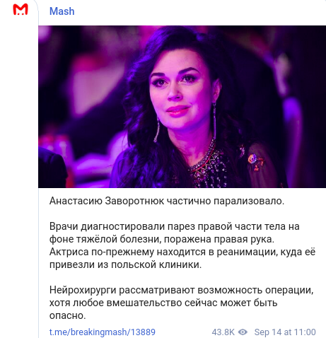 Актрису Анастасию Заворотнюк частично парализовало. Об этом сообщает Telegram-канал Mash в субботу, 14 сентября.
