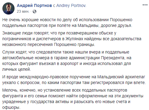 Портнов добавил, что установление всех поддельных паспортов Порошенуо и его семьи поможет найти оформленные на эти документы украденные у государства активы и разыскать его новые счета и офшоры.