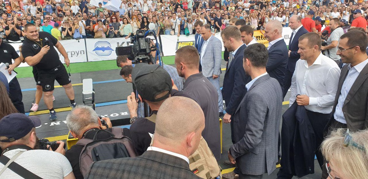 В городе на празднике проходил Чемпионат по стронгмену, куда явился глава государства. Так, один участников силового вида спорта закончил упражнение и на импровизированную арену вышел Зеленский с Богданом.