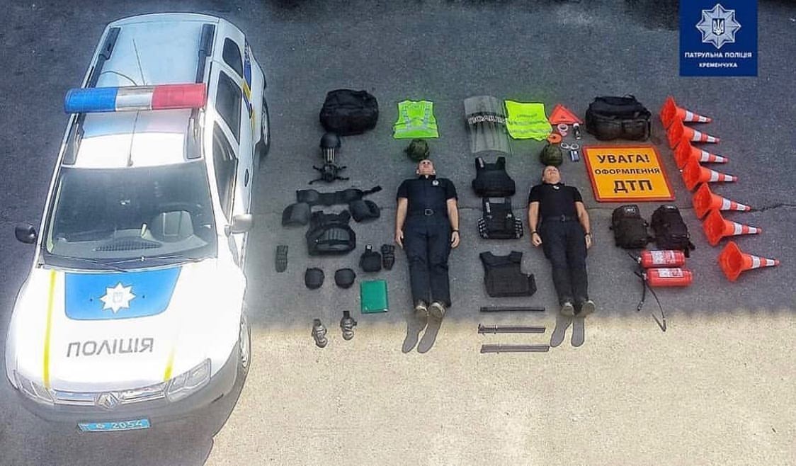 Экипаж патрульной машины из Кременчуга присоединился к флешмобу европейских полицейских, участники которого художественно выкладывают все содержимое своих служебных машин и фотографируются вместе с ним.