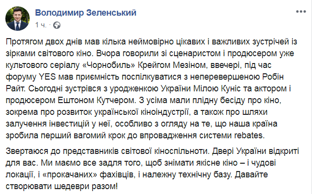 "В течение двух дней было несколько невероятно интересных и важных встреч со звездами мирового кино. Вчера говорили со сценаристом и продюсером уже культового сериала "Чернобыль" Крейгом Мезином, вечером, во время форума YES имел удовольствие пообщаться с непревзойденной Робин Райт. Сегодня встретился с уроженкой Украины Милой Кунис и актером и продюсером Катчером. Со всеми имели плодотворную беседу о кино, в частности о развитии украинской киноиндустрии, а также о путях привлечения инвестиций в нее, особенно учитывая, что наша страна сделала первый весомый шаг к внедрению системы rebates", - написал президент.