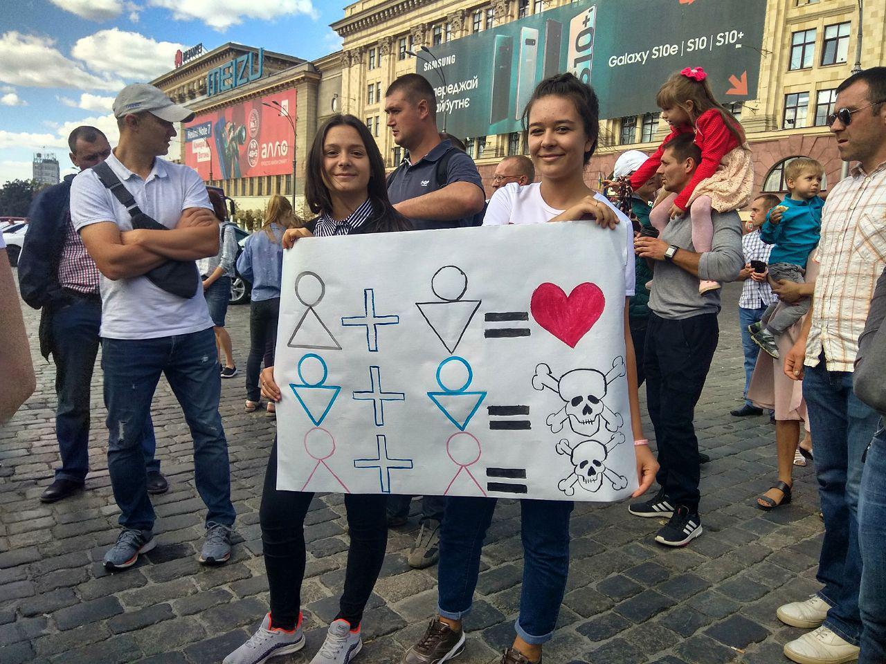 Перед началом марша, около 14:00, на оцепленную полицией площадь начали пускать людей. Наряду с участниками гей-парада туда прошли и его противники. Они развернули самодельные плакаты "Папа, мама, дети, дом! Украина не Содом!", "За традиционные семейные ценности" и другие.