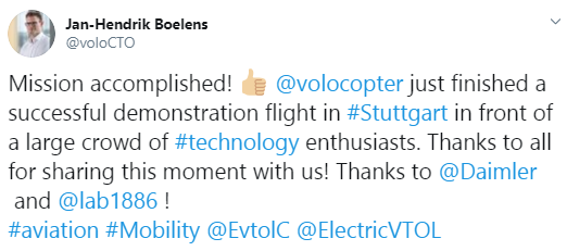 В субботу, 14 сентября в немецком Штутгарте удачно провели испытания двухместного беспилотника - волокоптера. Об этом в Twitter сообщил технический директор компании-производителя Volocopter Ян-Хендрик Беленс.