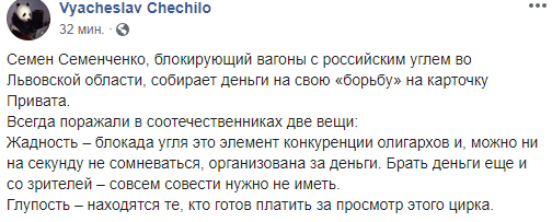"У Семена Семенченко видно закончились ресурсы после последней блокады и депутатство больше не приносит денег, теперь снова перешел к активным действиям. Будет качать Зеленского. Блокирует поезд с углем во Львовской области, который якобы из РФ и снова просит денег на карту... Сколько времени активисты будут выше закона? Выбрали уже новую Раду. Не нравится пиши обращение, ходи на приемы, регистрируйте петиции. Нет, надо палатки, одеяло, еда, волонтеры и движ", - добавил он.