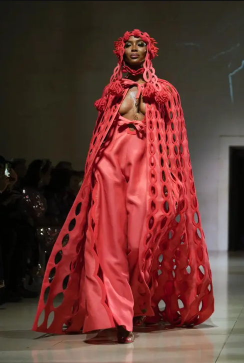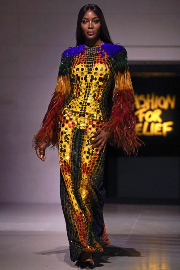 В рамках акции состоялся показ мод, на котором Наоми продемонстрировала два наряда. В первом сочетались материалы разных фактур, он переливался почти всеми цветами радуги и плотно облегал тело. Второй коралловый комплект с накидкой был весьма свободным, но зато почти полностью обнажал грудь.