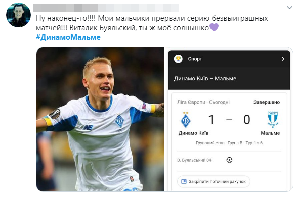 В четверг, 19 сентября, киевские динамовцы с победы начали выступление в Лиге Европы нового сезона. Подопечные Александра Михайличенко дома, на НСК Олимпийский, в традиционном белом обыграли шведскую команду "Мальме". Гол забил Виталий Буяльский на 84-й минуте напряженнейшей игры.