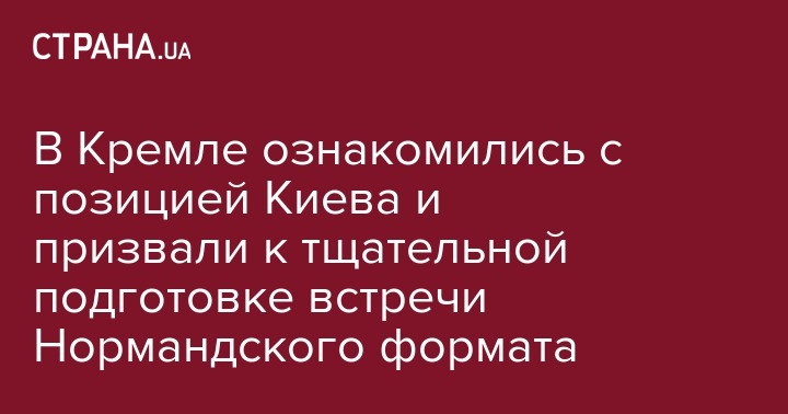 Пресс-секретарь президента России Дмитрий Песков заявил, что в Кремле ознакомились с позицией Киева относительно урегулирования ситуации на Донбассе и считают, что нужно тщательно готовить встречу в Нормандском формате. Об этом сообщает ТАСС.