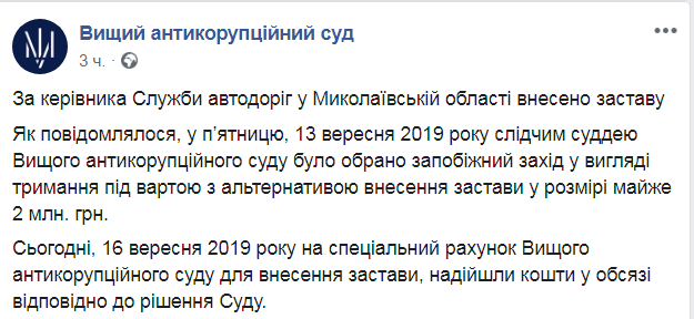 Об этом сообщает на Facebook пресс-служба Высшего антикоррупционный суда Украины.